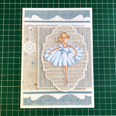 Stamp Tiny Townie Natalie and the Nutcracker onto white card, colour using your preferred medium and fussy cut around the outline.
